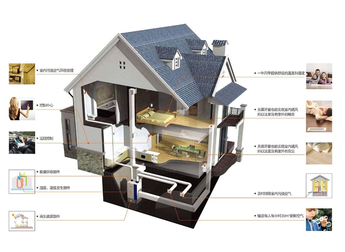 全屋新風(fēng)系統(tǒng)能夠獨(dú)立的進(jìn)行室內(nèi)空氣置換、凈化、流動系統(tǒng),在排除室內(nèi)的污染空氣的同時(shí),輸入100%自然新鮮空氣,并將輸入室內(nèi)的新風(fēng)經(jīng)過中效過濾、殺菌、增氧、滅毒、預(yù)熱(室外空氣較冷時(shí))等多項(xiàng)處理后再送入室內(nèi)。家庭全屋新風(fēng)系統(tǒng)的創(chuàng)新點(diǎn)是:用多臺新風(fēng)機(jī)按空氣流動原理,組成“全屋新風(fēng)系統(tǒng)“形成室內(nèi)新風(fēng)流動場。系統(tǒng)營造的是一種時(shí)刻保持室內(nèi)空氣潔凈、清新的、呼吸無憂無慮的健康室內(nèi)環(huán)境。